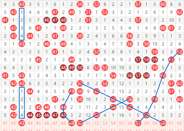 快乐8第072期41-60区域:第一个号码是43号,可以看到一个完美的对称走势。而且目前关注43,他基本上都是间隔4在开出,包括中间那个两重,然后就是49和50这两个号码。50,我们可以看到从56间隔一走到50的一个间隔一四连。这里推荐49.50同时开出,然后就是57号,可以看到62斜着给61,再斜着给60,然后间隔一给59,再间隔一给58,然后带出57的一个走势。最后就是60号一个大斜连,间隔一的大斜连。