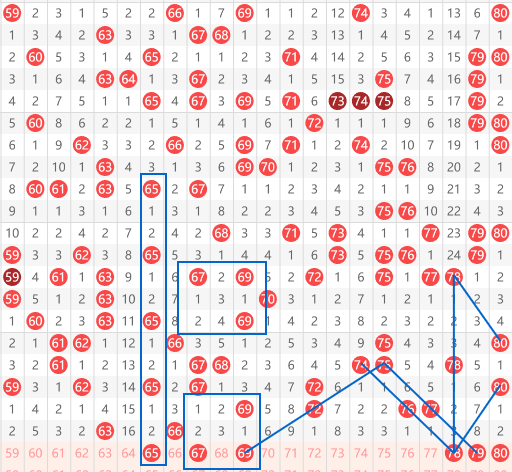 快乐8第2026072期61-80区域:推荐的第一个号码是65号,大家看到它最近是以间隔2的走势在连贯开出。然后还具备一个70开69,间隔一给68,开67,再间隔一给66,开65的走势。然后67号大家看到有一个典型的三倒三角走势,建议追号。然后69是间隔一、间隔三、再间隔一的对称走势,后面就是74这个号码,看到78间隔一给76,再间隔一给74,形成一个间隔一的斜连,然后就是7879这两个号码,可以看到74、75间隔一给76,77。那么再间隔一给78 79形成一个完美的形态走势,同时78本身又是一个间隔3的走势。