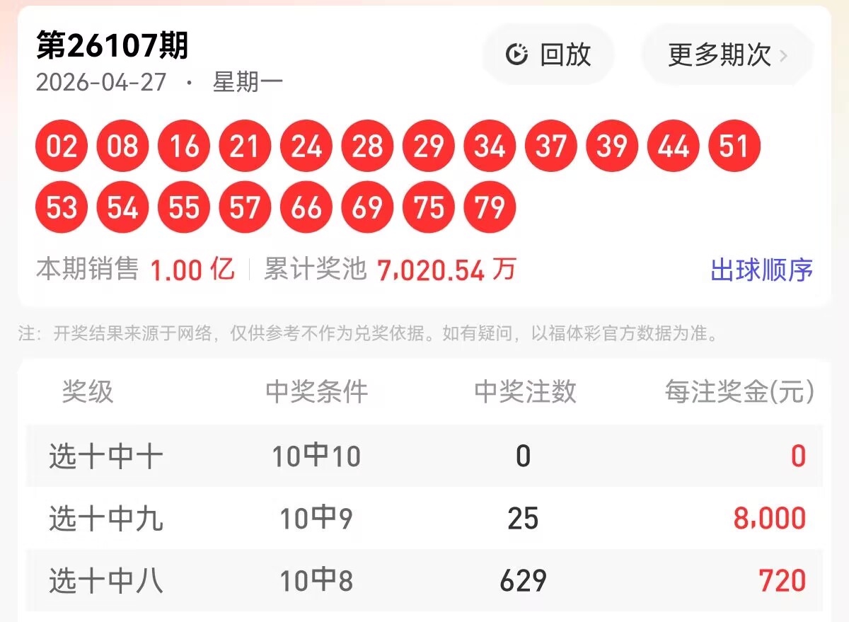 上期福彩快乐8第 2026107期开奖号码为【02 08 16 21 24 28 29 34 37 39 44 51 53 54 55 57 66 69 75 79】,其中大小10:10,奇偶比为11:9,和值为841,跨度77,四区间比为3:7:6:4。下面是对本期对于每个号码的详细分析。