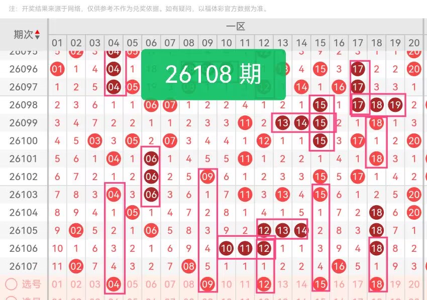 上期第一区间开奖3个号码,本期可能会增加开出。04是一区小号,目前遗漏4期,上期02开出后,04作为邻号回补,填补前端空白;09为奇数温码,上期08开出后,09紧邻热号,邻号联动性强;12是中段核心号,上期16开出后,12–15段空档明显,12处于中段平衡点,容易被前后号码带动开出;15为奇数过渡号,贴近上期16热号,平衡本区奇偶比例;18是一区高位偶数,上期16开出后,17–19空档需要填补,18位置适中,衔接二区号码,稳住高位结构。
