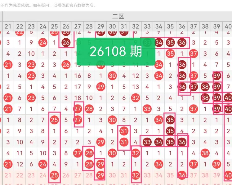 上期第二区间开奖7个号码,本期可能会减少开出。25是二区前端冷号,上期从21、24起步,22–27段空档明显,25遗漏充分;29和上期28、29形成连号联动,中区热号回落之后,29属于顺势温码,衔接性强,填补中段空档;32在二区中心点位,上期34、37密集,中间31–33空档明显,32在中心位,极易被带动开出;36是偶数过渡号,靠近上期34、37热区,属于热区后的平稳延伸;40是二区高位边界号,上期39开出后,40作为收尾号,邻号联动性强。