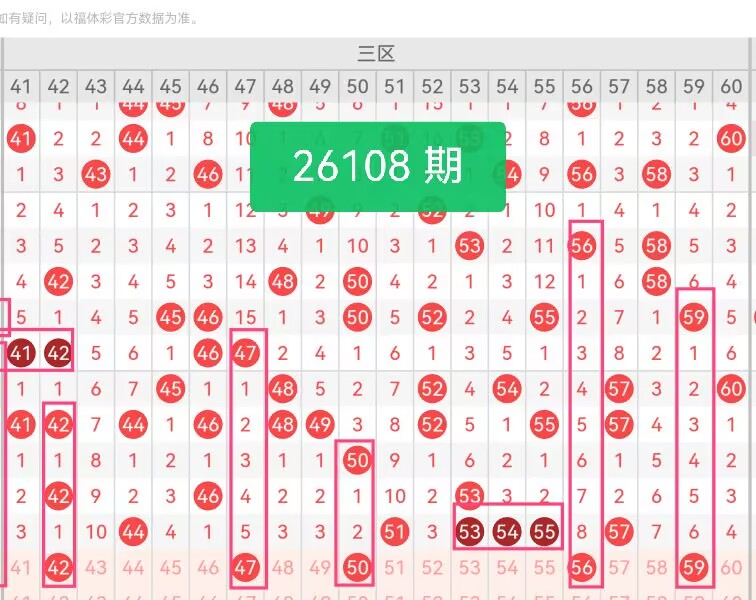 上期第三区间开奖个6号码,本期可能会减少开出。42紧贴三区起点,上期44开出后,41–45段空档明显,遗漏1期,回补概率高,容易被44带动连带出;47属于冷码,间隔5期、填补44–50中段空白,形成大梯队;50是三区中段偶数核心号,上期51开出后,50作为邻号联动,在中心衔接点,平衡区间结构;56为偶数温码,上期53–55密集,56紧邻热区,而且遗漏8期,回补概率极高;59是三区高位奇数,上期57开出后,58–60段空档需要填补。