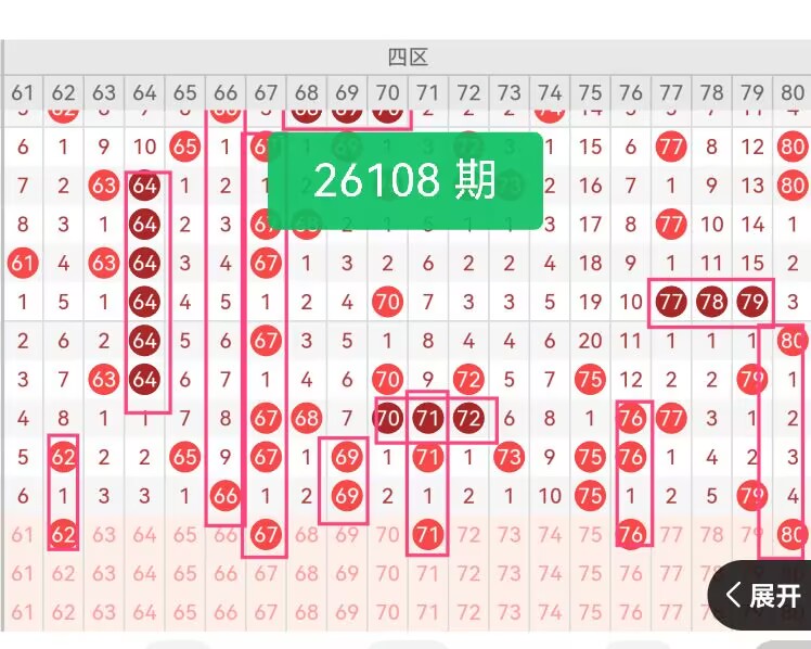 上期第四区间开奖4个号码,本期可能会增加开出。62是四区前端冷号,上期66开出后,62遗漏1期,填补前端空白;67为奇数码,和上期66、69形成邻号联动,前端回暖后,67顺势补位;71是四区中心号,上期75、79密集,71–74段空档明显,71中心支点位;76是偶数热号,近10期在75–80频繁开出,上期75、79开出后,76属于热号回补;80是尾号边界,紧贴78、79,上期79开出后,80作为收尾号,邻号联动性强。