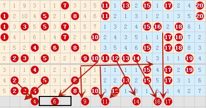 上期开出了2 3 4号这个3连号,本期是否会落号呢?感觉落号几率不是很大,我们就做防守吧,这里可以参考3 4号数字做防守。再来看4号到8号数字属于空三出号,本期这样的空三出号有三组,预测其中两组是要出号的,所以这里的5 6 7号要重点布防,可以在这里面选一胆码。上期说9 10 11 12 13 14号这个六连号还是要落号的,果然没让我们失望,落下了2个号码,那么本期是否还会落号呢?我们观察上图可以发现上期开了8 10 12号数字这种类型的跳号,本期出号就属于夹号类型,出号几率还是大的,所以可以重点布防一下。17号数字属于重号对称类型,关注一下就可以了。