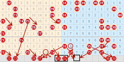 上图中22号数字我们已经追了2期,本期当然不能放弃,如果本期还不出号,我们在放弃已不迟,23号数字以前面的24 25号数字形成了三斜连,又是空三出号的中心号,所以我们要重点关注。28号数字这个冷号上期开了它的邻号29号数字,那么本期它的邻号开出几率就下降了,所以我们做防守就可以了。上期开出了32号这个小冷号,本期我们就要注意它的邻号和重号情况了,所以我们可以从30 31 33中选一胆码了。上期开出的35 37号都属于重号,本期应该是要断了,所以我们可以从它们的邻号下手,重点参考38 39号数字吧。