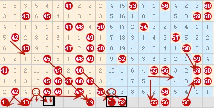 我们观察上图可以发现近两期内在41-50号数字之间出号个数都是比较多的,所谓盛极必衰,所以本区域会不会断号呢?在该区间还是防守为主吧。44号这个冷号本期应该也是开不出来的,前两期都是出了邻号,本期也可作防它的邻号,如果本期开出它的邻号,那么下期就要注意它本身开出来了。近期内4斜连、5斜连开出的有点频繁,所以上图中的49 51号数字必须做防守,51号数字又是一个冷号,它的邻号情况我们也要考虑的,所以我们可以从49 50 51 52号中认真作防选一胆码出来。55 56号这个两连号上期落号了,那么我们本期参考一下就可以了。