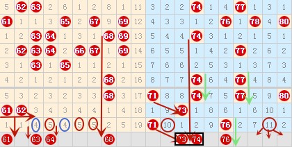 上期在61-70号区间居然断号了,出乎预料,那么本期在该区间就可以重点布防了。首先我们避开66 67号这个两连号,等他落号或者它俩的邻号出号了,我们再来重点关注吧。那么我们可选范围就缩小了,先来看59 60 61 62这个四连号在上期没有落号下来,那么本期落号几率就很大了,可以重点作防了,这里我们就定61号数字做参考吧。在该区间有三组同期遗漏值的号码,我们就从63 64号数字下手作防吧。68号数字属于重号对称类型,这种类型的组合近期开的也是比较频繁。我们也是要重点关注的。72号数字这个冷号预测本期也是开不出来,我们可以从他的邻号作防,参考73号数字。74号数字和前面的68号数字属于同种类型,两种同种类型的号码在一个区间是最容易开出来的,所以我们可以从68 73 74号数字定一胆码出来了。好了,本期分析就到这里了。
