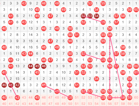 第三区间首先看一码42的回补有机会,然后防守一下45的回补有机会 ,再看5期值的50三斜连走出的机会还是很大的。然后看55 56二选一出一个有机会,58 59也是二选一出一个有机会,该区间可推荐的选二搭配组合有01 50或者56 58.第三区间胆码主看50 56 58 59