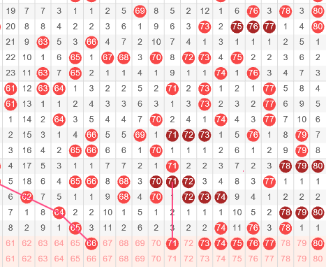 第四区间首先防守一码66的下落有机会,然后6字头的号码我比较纠结就直接不选了,直接看7字头的号,首先71号码球可看回补有机会,然后73 74 75 76 77这里五个号码球有机会出二到三个有机会,大家可自己选一选,然后尾部的80可以防守一下,机会还是很大的,该区间可推荐的选二搭配组合有71 77或者01 80,第四区间胆码主看71 74 77 80