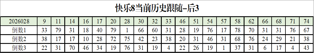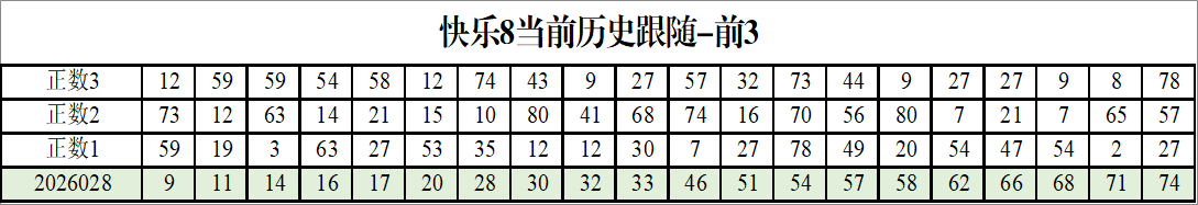 我感觉选热的同时,还要注意防冷条件开出,可以直接选取每个号码跟随出次前三的号码,也可以考虑把出次最后的三个数字加进去,不过这样可能号码太多,可以尝试。图上也能看出单独号码跟随的情况,我就不一一统计每个号码的出次了,我这里考虑提高概率,取每个号码历史跟随的前三号码和后三号码,根据2026028期的号码,我关注正数3和倒数3的号码号码为: