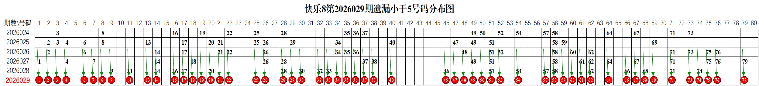 所以这个条件值得关注,从号码分布图上我们可以分析出,遗漏小于5期的号码有: