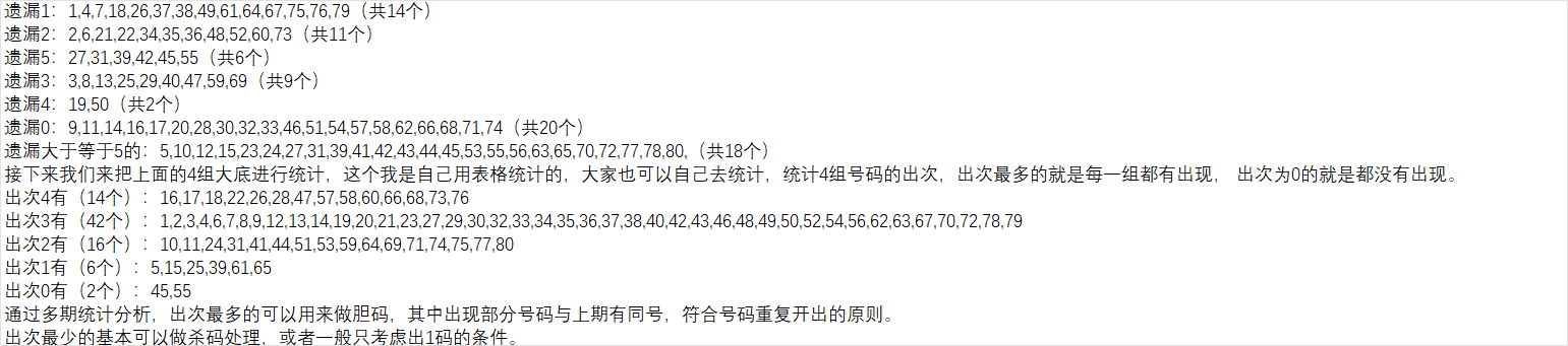 如果把对数和补数合起来有40个号码,中间可能还会产生一下重复数,通过近几期的统计分析,以上期数据进行补数对数计算推算下一期的概率不高。为提高概率,我主要是用前两期的数据来进行对数补数推算,然后再组成一个集合,作为我的第四组大底号码。