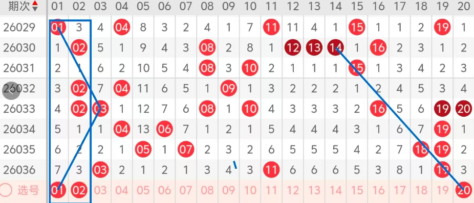 第一区间的走势分析:第一区间上期开出了三个号码球,主要的落号点位在一区间的后半区,走出了三奇的形态走势,上期一区间的前半区落下了一个号码球,后半区落下了两个号码球,整个一区间处于走冷的趋势,根据一区间的走势规律,今天的一区间我们主看一区间龙头凤尾处号码的落位,龙头主看01 02姊妹对的落位,也是热码的回补,再看凤尾处20的回补,走出了斜连码的走势,这三个号球建议大家打个三胆拖,或者打个三码复二比较稳妥,参考为主!