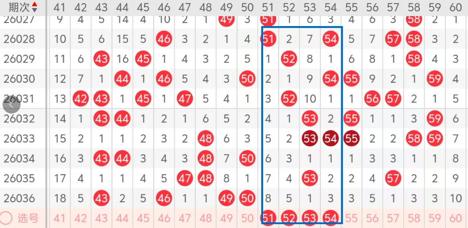 第三区间的走势分析:第三区间上期开出了四个号码球,主要的落号点位在三区间的前半区,走出了两奇两偶的形态走势,上期三区间的前半区落下了四个号码球,后半区没有号码球落下,整个三区间处于走温的趋势,根据三区间的走势规律,今天的三区间我们主看三区间后半区龙头位置连码的落位,主看51 52 53 54这四个号码球的落位,51 52走出了夹码的走势形态,53 54走出了热码回补的走势形态,这四个号球建议大家打个四胆拖,或者打个四码复三比较稳妥,参考为主!