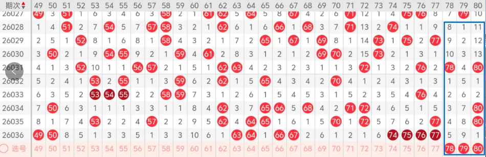 第四区间的走势分析:第四区间上期开出了八个号码球,主要的落号点位在四区间的前后半区,走出了四奇四偶的形态走势,上期四区间的前半区落下了四个号码球,后半区落下了四个号码球,整个四区间处于走热的趋势,根据四区间的走势规律,今天的四区间我们主看四区间凤尾处号码的落位,主看78 79 80这三个号码球的落位,注意它们两两组合的落位,至少有一码落下,这三个号球建议大家打个三胆拖,或者打三码复二个比较稳妥,参考为主!