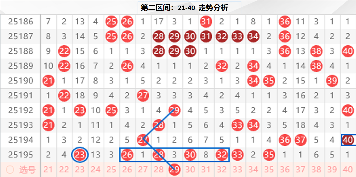 二区分析:【21-40】(走势图标注号码非小黄车大底,请谨慎参考,具体思路将在直播间分享讨论)