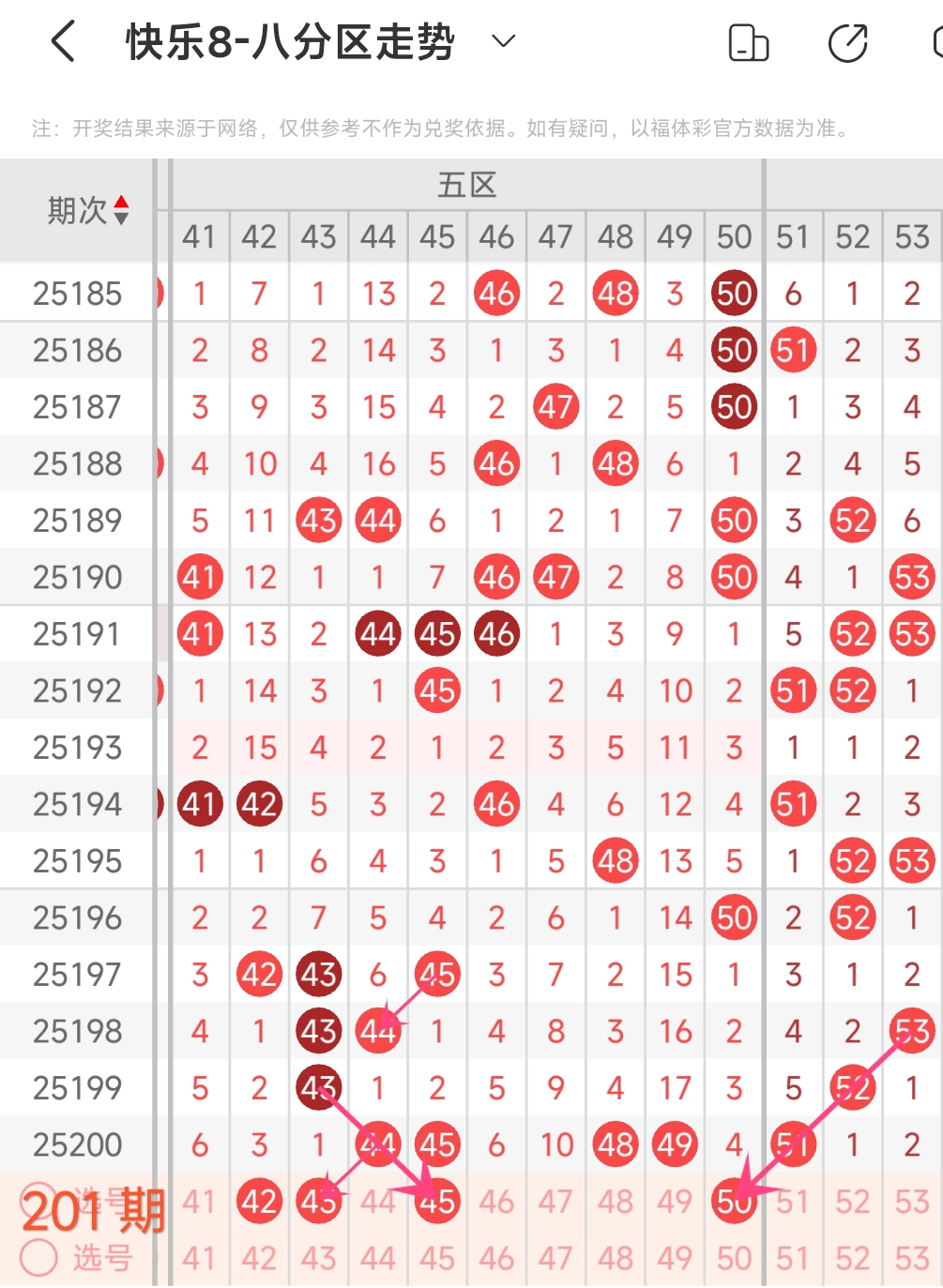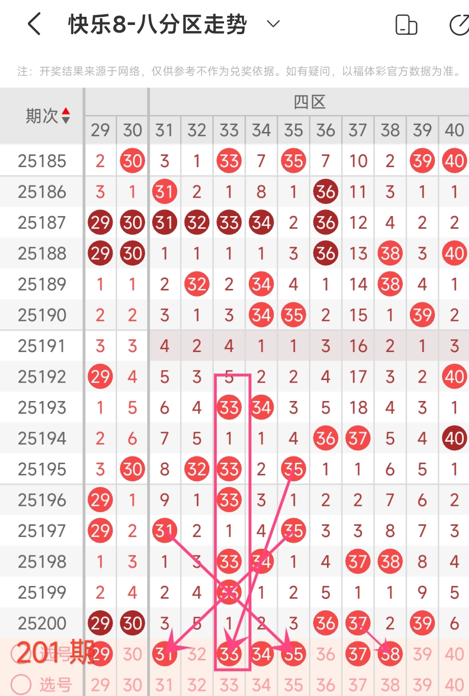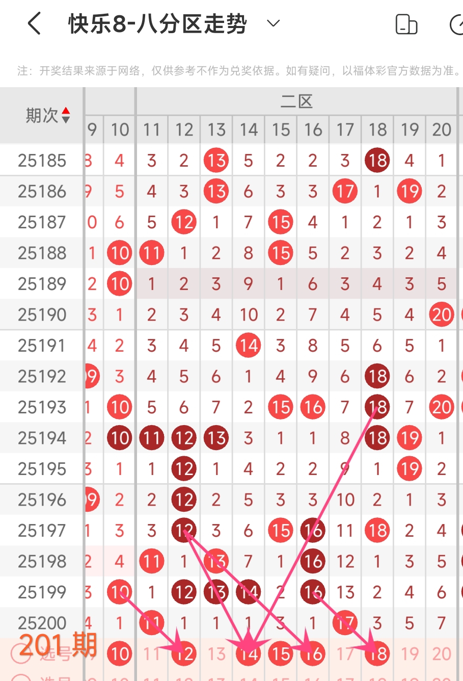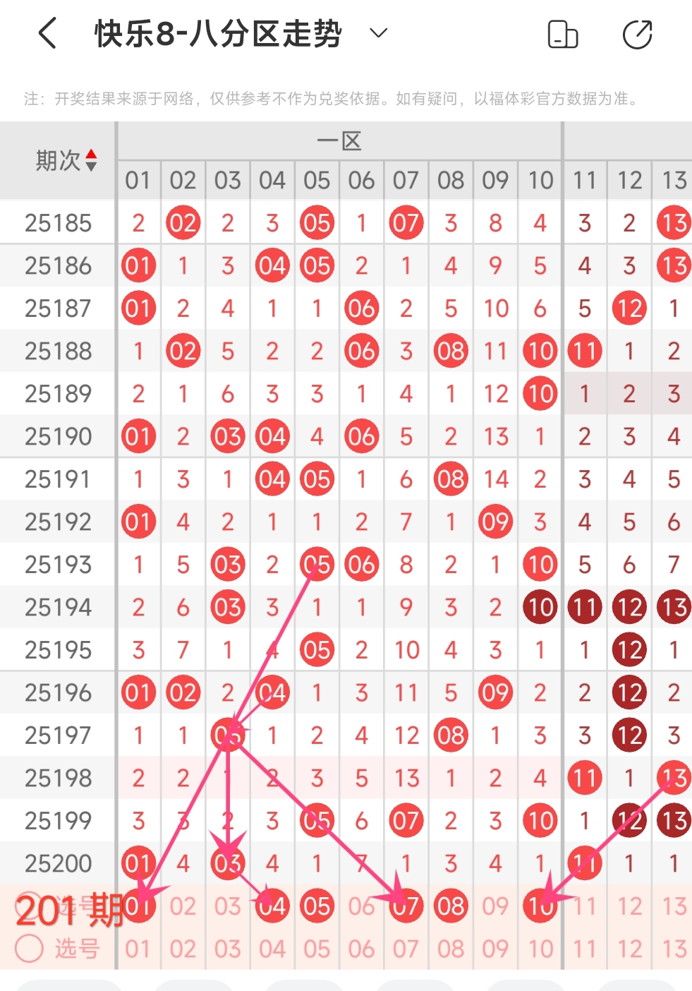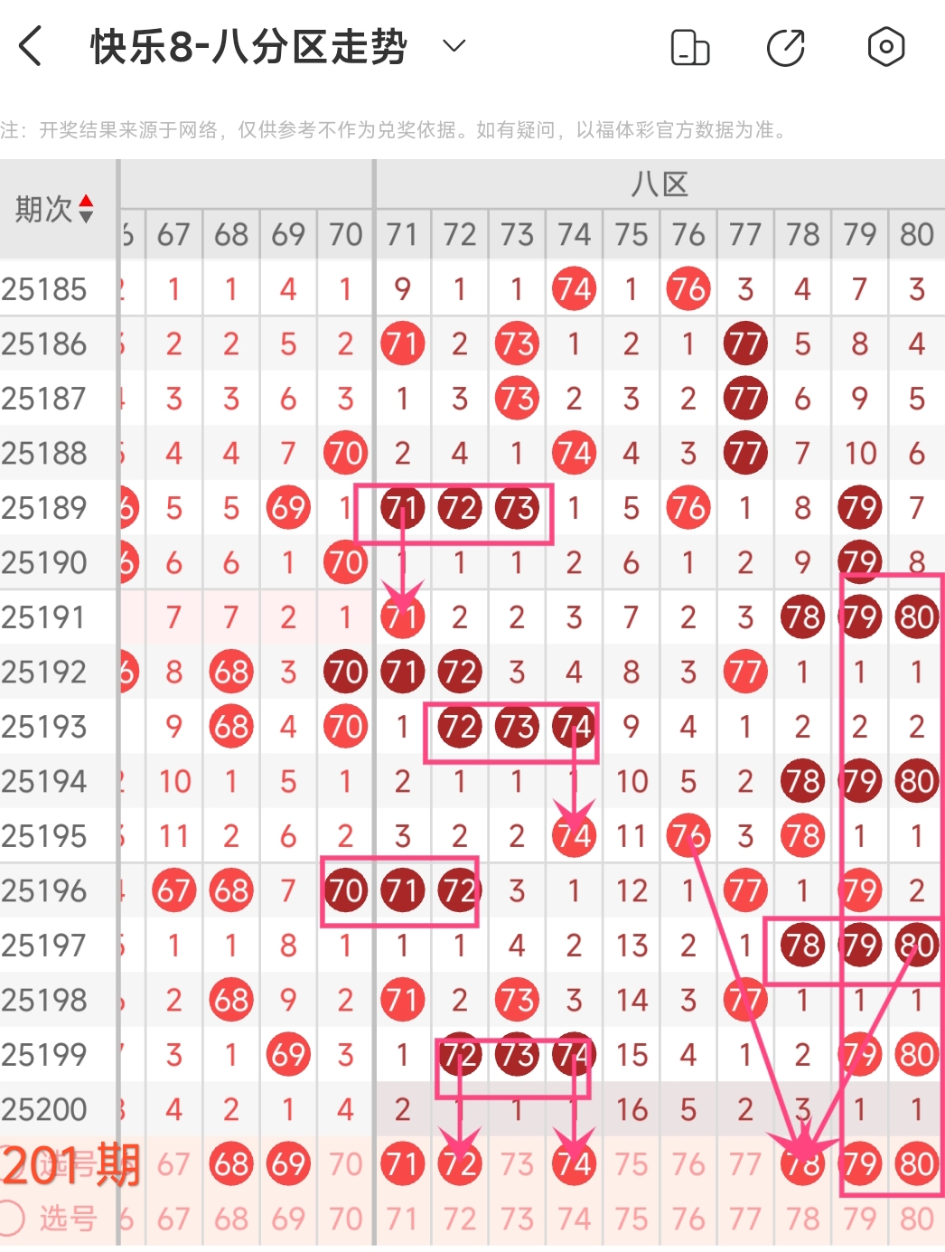 在快乐8的探索之旅中,通过对开奖走势图细致入微的观察,我们总结出一些具有参考价值的规律。几乎每一期开奖号码都呈现出以下显著特征:其一,大概率出现连号;其二,常常伴有边码;其三,遗漏值为1 2 3的号码频繁现身;其四,重号现象也较为常见。掌握这些要点,能为我们的投注提供方向指引。我们约定采用八分区走势图来展开分析。