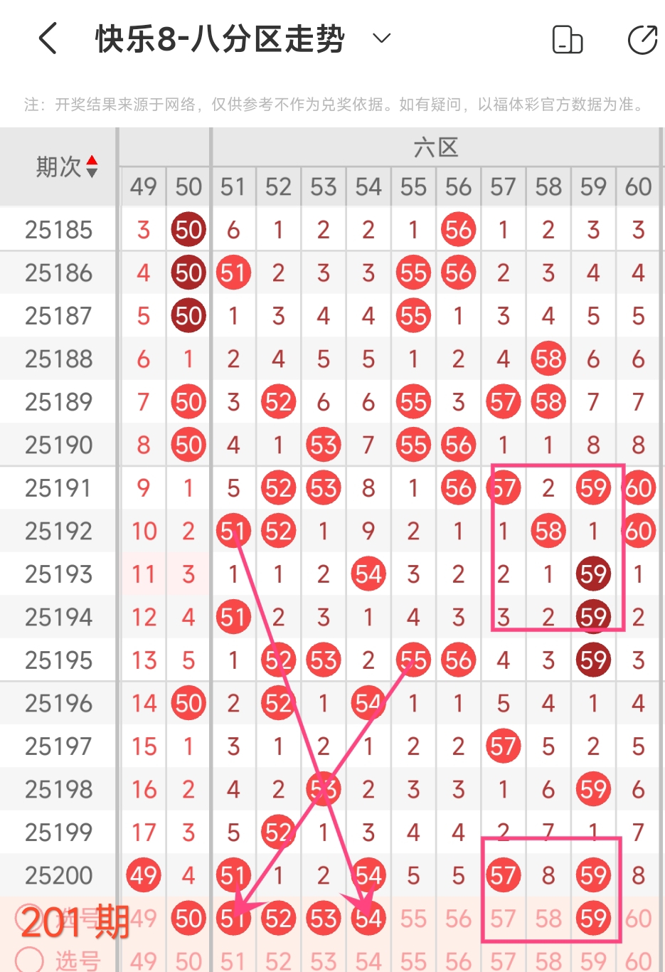 上期六区开出51 54 57 59这4个号码,本期应该出3个。