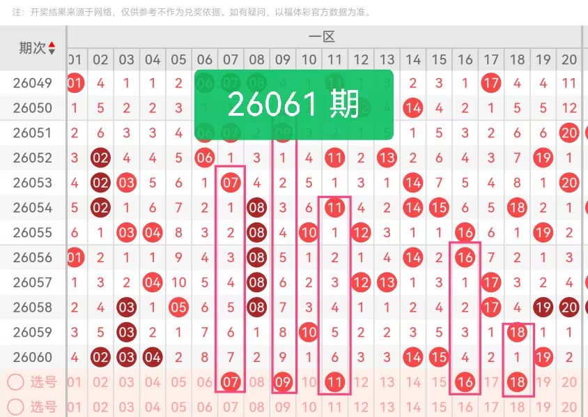 上期第一区间开奖6个号码,本期可能会减少开出。07作为一区中段的冷号,在上期一区小号段02、03、04密集开出后,具备明显的补位潜力,能平衡区间小号端的热度密度;09是一区中位温号,近阶段出现频率稳定,是衔接小号与大号的关键过渡号,能让区间走势更自然;11为一区奇数冷号,填补了14、15之后的区间空白,加入后让一区的奇数分布更均衡,避免单侧偏重;16靠近一区尾端,承接了14、15的密集开号趋势,具备区间延伸的潜在可能,能延续一区的整体热度;18是一区大号段的温号,与19相邻却保持独立,避免与前期号码过度扎堆。