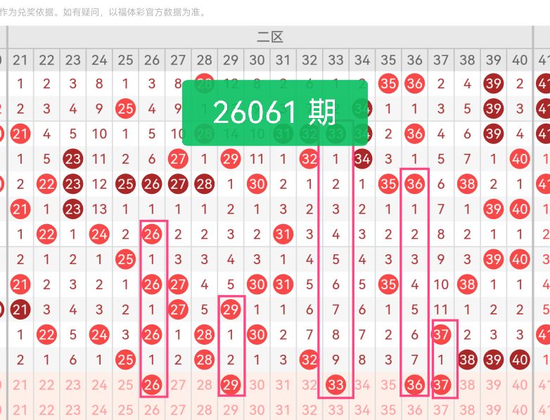 上期第二区间开奖6个号码,本期可能会减少开出。26是25的邻号,上期二区开出25,邻号顺势延续热度,能让二区小号段的走势保持连贯性,不会出现热度断层;29填补了28与32之间的间隔,让二区中段不再出现空白区域,平衡了区间内的号码分布密度;33是二区的奇数号,近期二区奇数号出现频率较低,补位后能让二区的奇偶比例更协调,同时33与32、38形成合理跨度,支撑起二区中段的整体结构;36靠近二区尾端,承接了38、39、40的收尾开号趋势,与尾号形成呼应,增强二区整体的延续性;37是二区大号段的冷号,与38、39相邻却未扎堆。