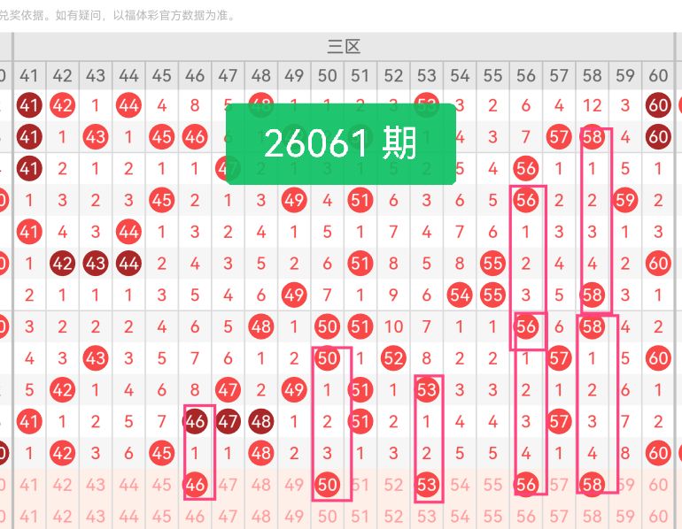 上期第三区间开奖4个号码,本期可能会增加开出。46是45的邻号,承接上期三区小号段的阶梯走势,保持区间前端的连贯性,让三区的整体走势不脱节;50是三区中位冷号,近期三区中位区域开号频率偏低,补位后能平衡区间整体分布,避免单侧偏重;53居于三区中间位置,是支撑整个区间的核心号码,衔接了前端的46与后端的56、58,让三区的跨度分布更均匀;56是三区尾端的温号,承接48的热度后,向三区尾端逐步延伸,增强了区间后端的活力;58靠近三区尾端,填补了56与60之间的间隔,避免三区大号段出现断档,同时与56形成相邻搭配。