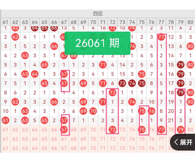 上期第四区间开奖4个号码,本期有望增加开出。69是67的邻号,承接上期四区小号段的连开趋势,让四区前端保持热度延续,避免区间热度骤降;72是四区中位温号,衔接69与75之间的空白,平衡了四区中段的分布,让区间整体更完整;75是四区大号段的冷号,近期四区大号段开号密度较低,补位后能为区间补充冷号活力,同时75作为中坚号码,承上启下连接前后号码;77与75相邻,延续75的热度,增强四区大号段的连贯性,又不与前期号码过度扎堆;79是四区尾端的冷号,靠近80区间,补位后能延伸四区的尾端热度,与77形成小跨度。