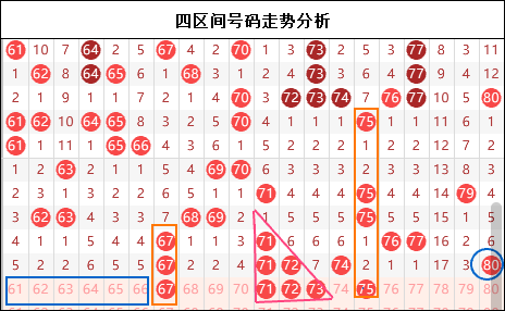 第四区间思路:四区我们昨天布局以龙头67起步,与一区思路完全是符合的,这样来看,今天的四区龙头和一区龙头有着比较看好的思路。如果本期在意思区龙头位置有好的思路倒是可以直接在这里布局就能拿下四胆。不过四区近期这个半死不活的走势,还真有点让人摸不到头脑。唯一一个思路就是四区的重号在近期似乎有着崛起的走势,可以在这一方面多作文章,也许这是个意外的收获。
