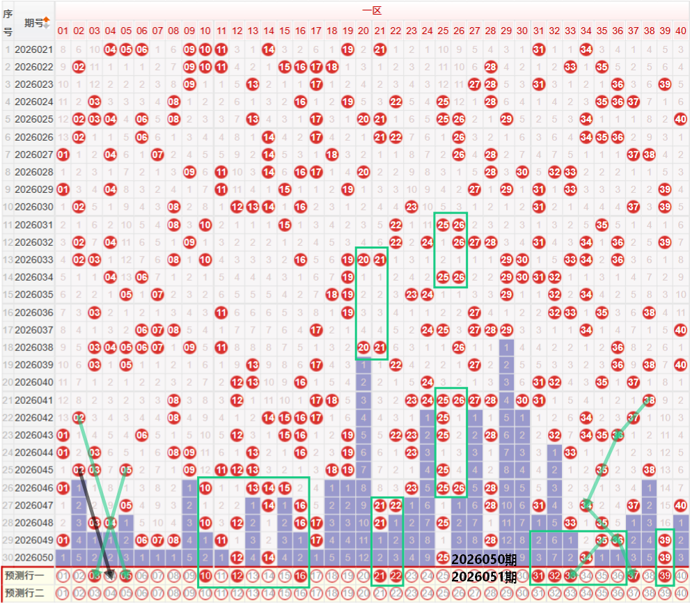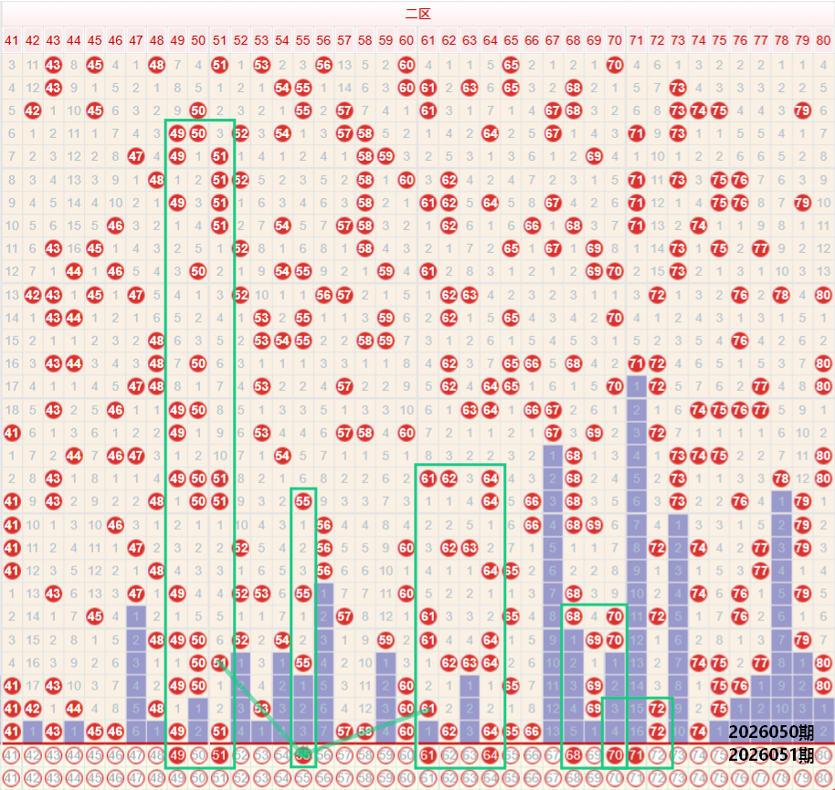 如图所示:在本期大数区的选号中注意在上期的走势中三区间开出了9枚中奖号码,落位在区间的最高位走势,在近30个开奖周期内二区间同样开出过9枚中奖号码,在其下期的走势中出现了落号数量大幅度下降的走势,本期注意三区间的落号数量出现相同的走势,在上期的三区间落号形态中多见于奇数的走势,这里要注意49的位置目前保持着连续多期的走势,在上期开出49 51的奇数二连走势下方注意49 51的同时走重形态,以及在上期开出51 60之后,本期注意55的夹号走势,四区间上期开出6枚中奖号码,开出了64 65 66的三连号走势,以及62 64 72 74的同形态走势,尾部位置出现了连续多期的断号走势,本期注意72的重号走势下方考虑71的冷号走势,以及70 71的二连走势,或者是考虑68 71的同路双码走势,6字头在上期开出三连号的位置注意重号的选择,重点关注64的重号走势,以及61 64或者是61 64 70的同路多码走势。