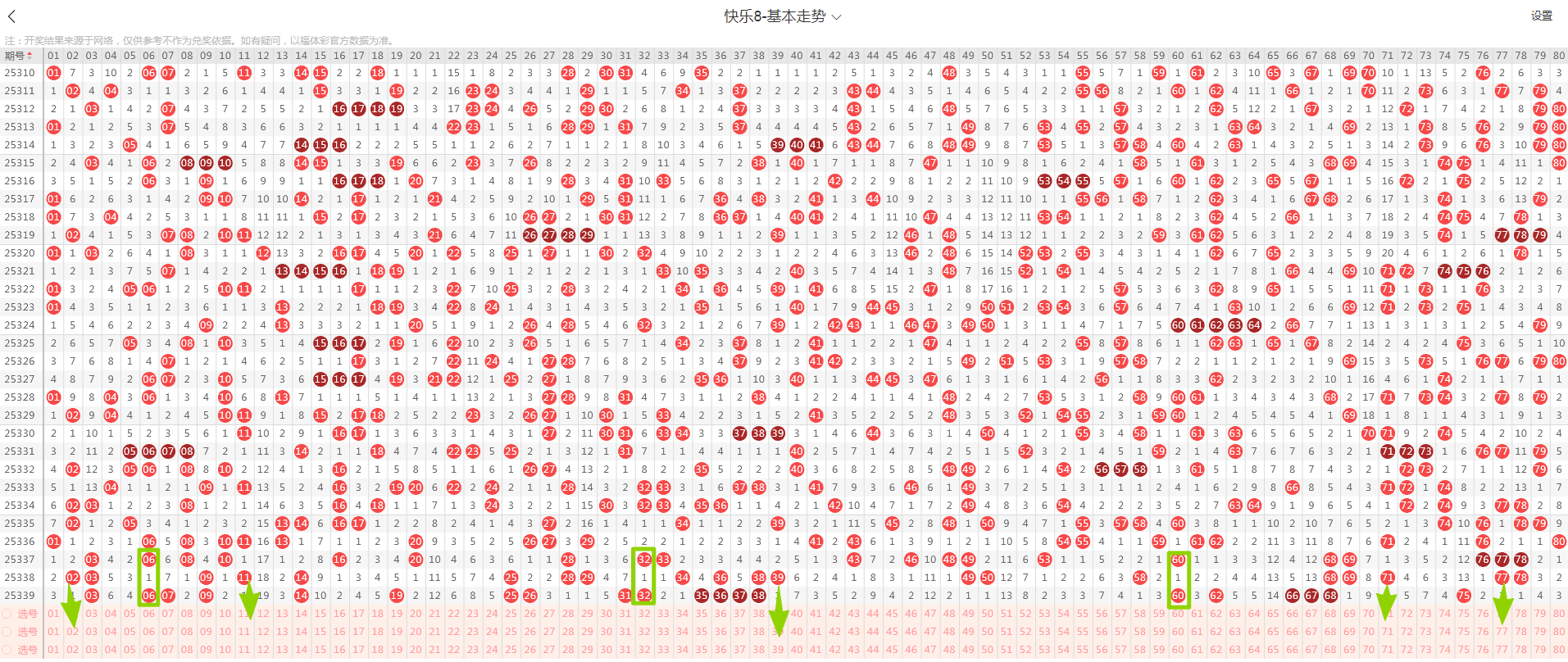 从这张走势图可以看到我画标出来了遗漏示意号码,开出了隔期(遗漏一期的)3个号码(绿色方块标示的),数量与上期一致,从近期走势图看隔期码回温态势形成,本期判断热度回温,落号5个号码概率较大(绿色箭头标示的02、11、39、71、77)需要关注,有下号概率;