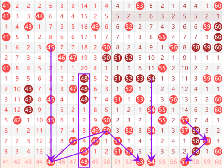 ⭐三区重点号码:45 48 54 57,防守号码:53