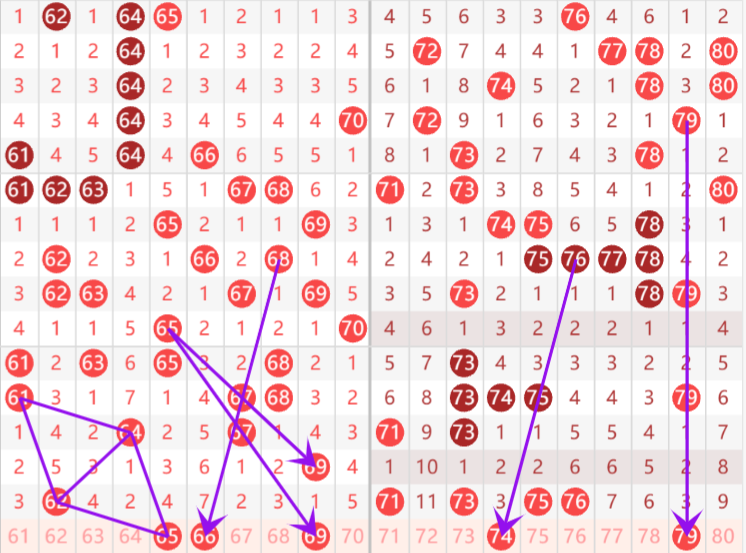 上期四区间开出62 71 73 75 76 四个号码,四区间整体热度上升,本期四区间热度持平,预计开出号码五个,本期四区间重点号码推荐,重号重点推荐,邻号重点关注74,孤号重点推荐65 66 69 79;