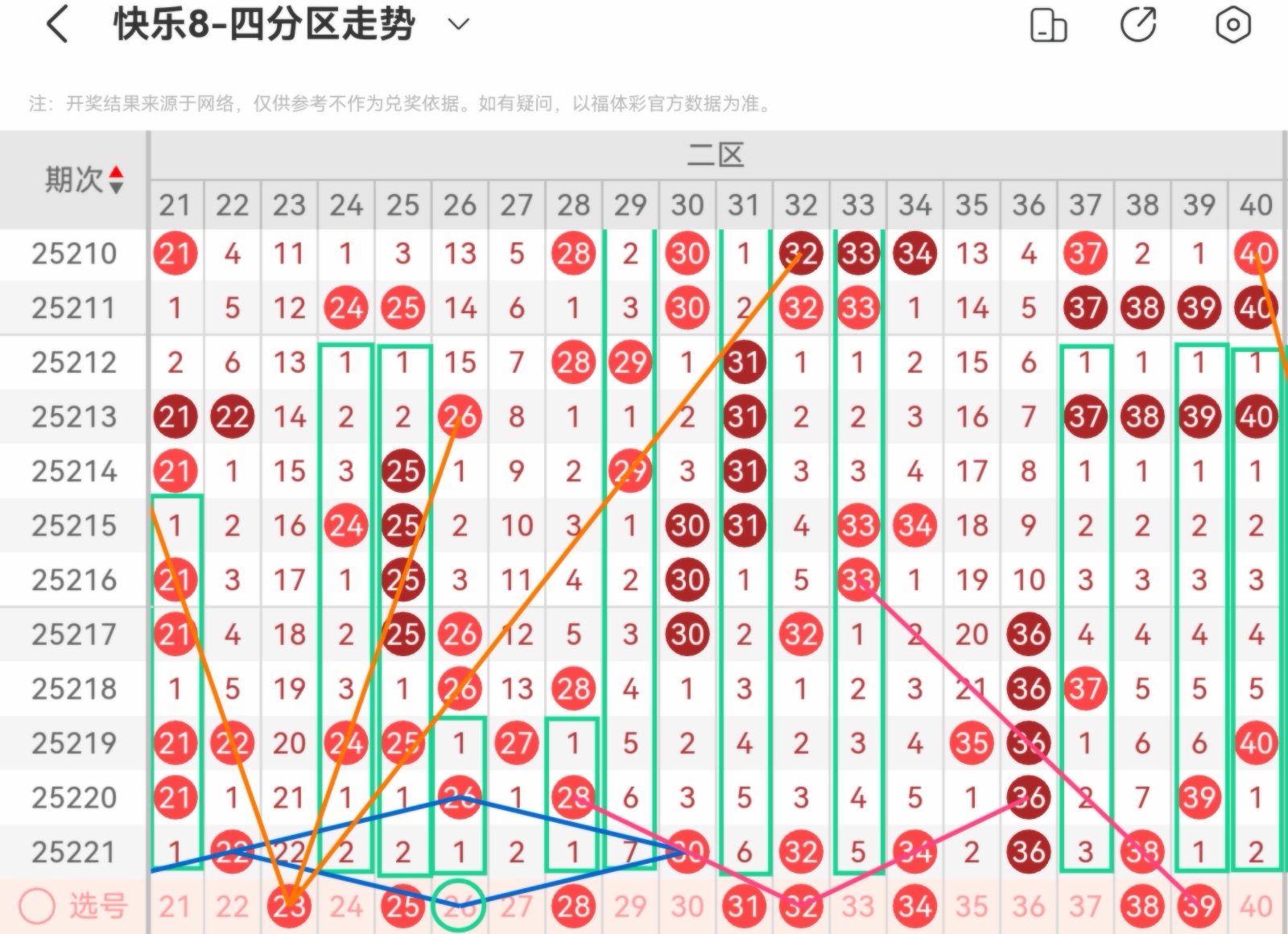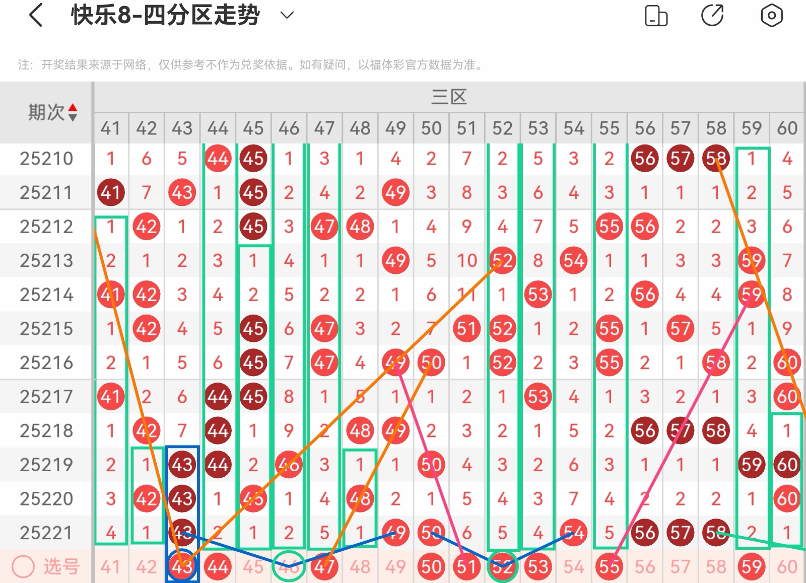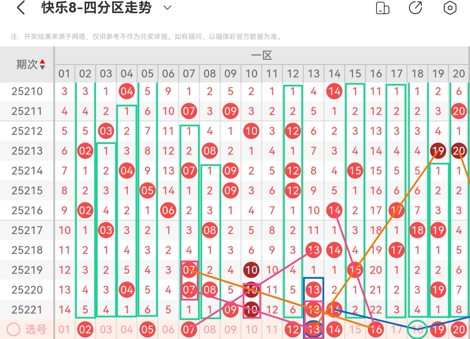 大家好,我是甜丝丝的坏事,主要以快乐八的形态走势、空位走势、遗漏走势以及斜连走势相结合的方法,用公认的四分区走势来进行预测分析,希望能让你有所收获。