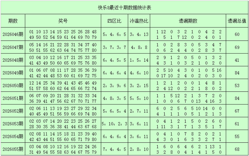 一、快乐8第2026056期奖号分析(定义:遗漏0-2期号码为热码,遗漏3-6期号码为温码,遗漏7期及7期以上号码为冷码,重码为上期开出奖号,邻码为上期没有出现,但与上期奖号差值为1的号码,例如上期开出奖号04,没有出现号码03和05,则本期03和05都为邻码,其它则为孤码。