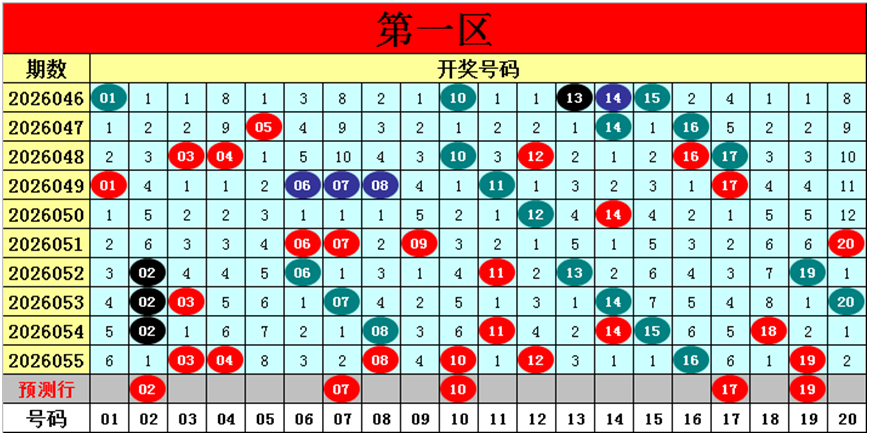 目前第一区包含14个热码:重码7个03、04、08、10、12、16、19,邻码6个02、07、11、15、18、20,孤码1个14;包含5个温码:邻码3个09、13、17,孤码2个01、06;包含1个冷码:邻码1个05,孤码0个;号码冷温热个数比为1:5:14,重号、邻码、孤码个数比为7:10:3。