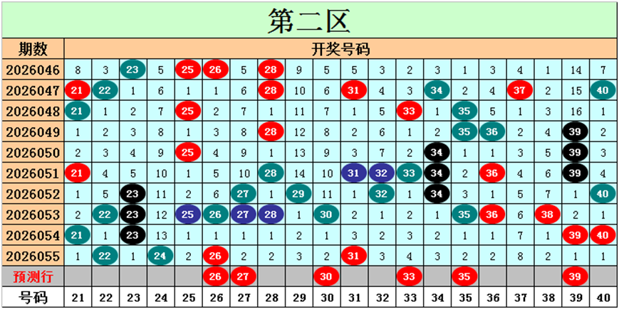 目前第二区包含15个热码:重码4个22、24、26、31,邻码5个21、23、25、27、30,孤码6个28、35、36、38、39、40;包含4个温码:邻码1个32,孤码3个29、33、34;包含1个冷码:邻码0个,孤码1个37;号码冷温热个数比为1:4:15,重号、邻码、孤码个数比为4:6:10。