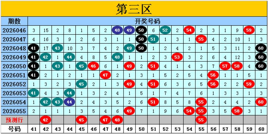 目前第三区包含10个热码:重码4个49、54、55、58,邻码0个,孤码6个41、42、43、44、51、60;包含8个温码:邻码5个48、53、56、57、59,孤码3个45、46、47;包含2个冷码:邻码1个50,孤码1个52;号码冷温热个数比为2:8:10,重号、邻码、孤码个数比为4:6:10。