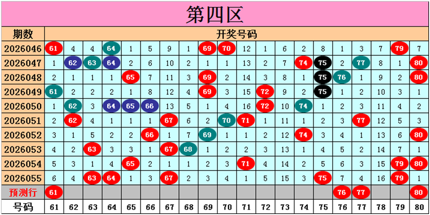 目前第四区包含9个热码:重码5个63、64、67、75、79,邻码3个65、68、80,孤码1个71;包含8个温码:邻码3个62、66、74,孤码5个61、69、70、72、77;包含3个冷码:邻码2个76、78,孤码1个73;号码冷温热个数比为3:8:9,重号、邻码、孤码个数比为5:8:7。