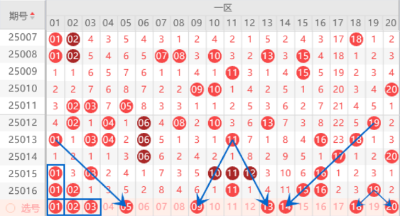 该区间上期开出了01 02号数字,本期我们注意一下出一个重号的情况,其中的02号数字我们可以重点关注一下,本期可以防守一下02 03号数字同出的情况。本期的05 06 07号数字是属于重号06号数字的边号回补号码,本期我们可以在这里定一个胆码出来,本期我们重点关注一下05 06号数字出一个号码的情况。本期的09 13号数字都是属于三斜连号码,本期我们注意出一个号码的情况。本期的14号数字六斜连号码,我们可以防守一下出号情况。
