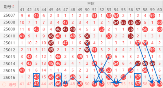 该区间上期开出了43 45 46 48号数字,本期我们要注意出重号的情况,其中的45 46号数字我们可以重点关注一下出一个重号的情况,夹号47号数字我们也是可以关注一下出号情况。上期开出了53 55 57号数字,本期我们注意一下57号数字出重号的情况,夹号54号数字我们也是可以关注一下。本期的59 60号数字我们注意一下同出的情况,属于连号斜连号码,出号机会是比较大的,我们可以在这里定一个胆码出来的。