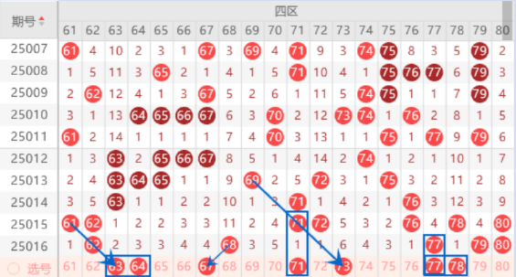 本期的阶梯号码64 65 66 67号数字我们要注意出两个号码的情况,其中的64 65 67号数字我们可以重点关注一下出号情况。本期的63号数字是属于三斜连号码,出号机会是有的,我们可以关注一下。本期的71 72号数字我们注意落下一个号码的情况,其中的71号数字我们可以重点关注一下出号情况,本期可以防守一下71 73号数字同出的情况。上期开出了77 79 80号数字,本期我们注意一下出重号的情况,其中的77号数字我们可以关注一下出号情况。本期的夹号78号数字我们也是要关注一下的,属于复制号码,出号机会也是有的。
