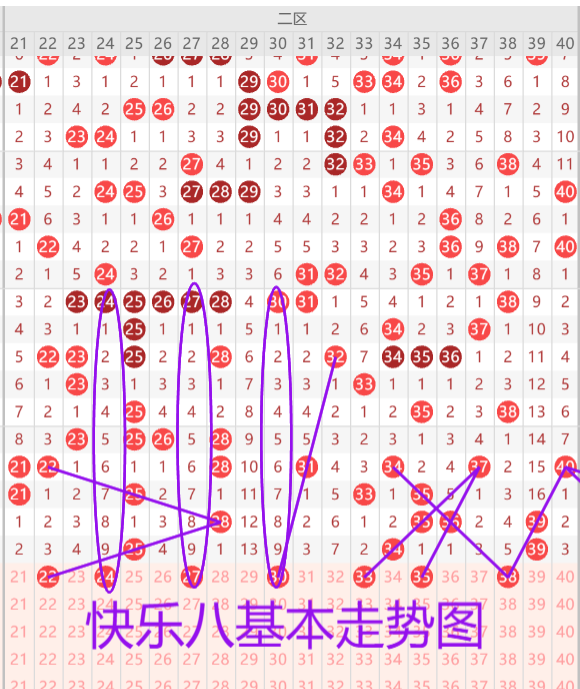 我们来看下二区的基本走势情况,上期开出了三枚开奖号码,本期预计开出4-5枚开奖号码,首先我们来看同路三斜连回首掏的22重点考虑。遗漏九期的24 27 30同路三码建议三选一或者三选二。33 35 38均为三斜连走势及形态建议三选一或者三选二。