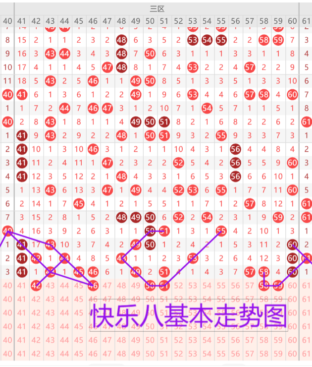 我们来看下三区的基本走势情况,上期开出了九枚开奖号码,本期预计开出4-5枚开奖号码,首先我们来看三角形走势的42 46建议二选一。50 51的堵漏回首掏形态可以考虑同出。58 59 的堵漏形态考虑同出。50 51和58 59建议二选一去做。
