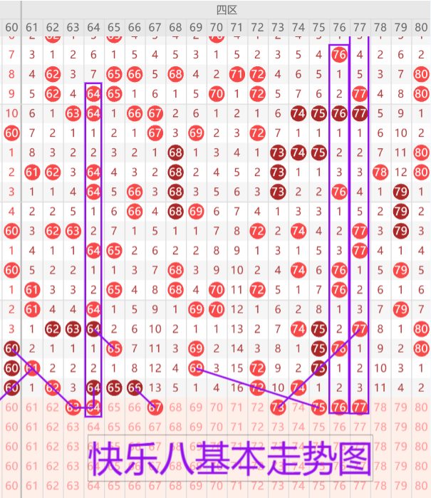 我们来看下四区的基本走势情况,上期开出了六枚开奖号码,本期预计开出4-5枚开奖号码,首先我们来烂63 64的堵漏三角形同形态二连建议定胆。67的遗漏13期三连好的边号重点关注。73的无斜连遗漏10期防守为主。75的三斜连。76的3322遗漏,77的5533遗漏建议76 77二选一或者同出。
