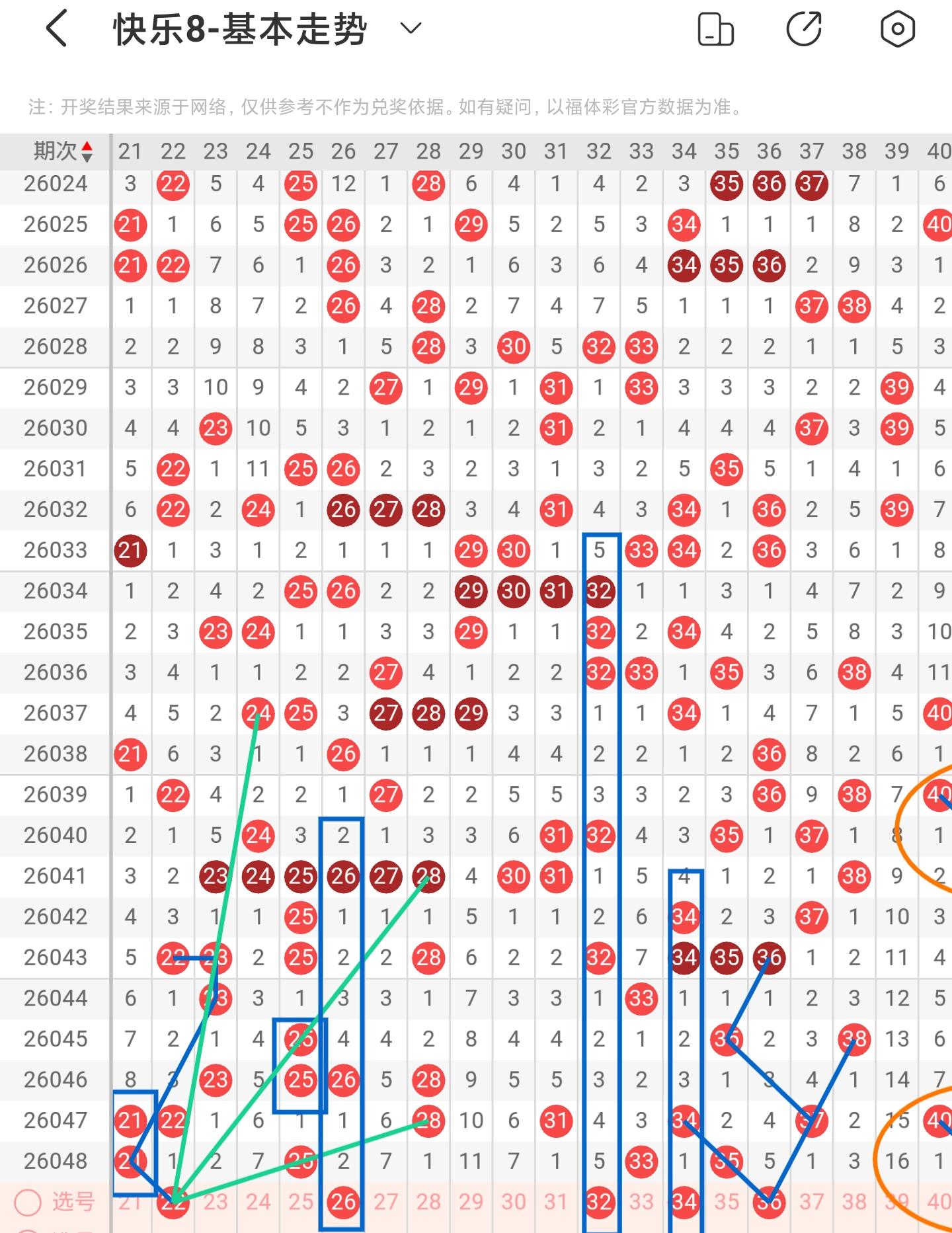 二区间大面积减少落号,一共开出四个号码球,本期考虑增加号码球的数量,注意百期相似形态的22、36号码球,同时22号码球也是斜连走势回补号码球,注意隔期对称回补的26号码球,注意期数和值对称回补的32号码球,注意期数和值加减法的34号码球,以25号码球为对称走势起点,注意走势形态的36号码球,同时也是斜连走势回补号码球,因此二区间关注22-26-34-36。注意本区间的选二复式22-34-36。