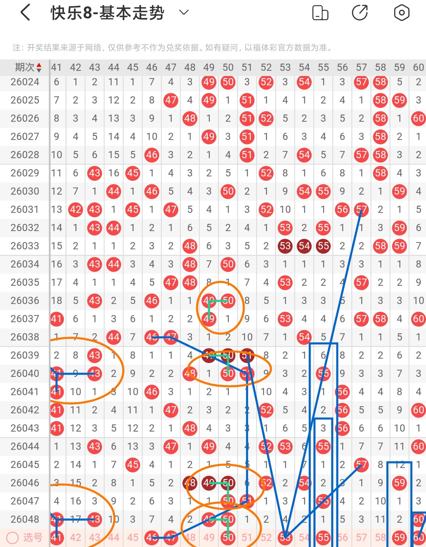 三区间上期小面积增加落号,一共开出五个号码球,本期考虑等同数量的号码球,以38号码球为对称走势起点,注意走势形态的41号码球,注意近期41、43号码球同期下落,下期回补重落一码,防守百期相似形态的45号码球,以51号码球为对称走势起点,注意走势形态的46、47号码球,注意近期49、50号码球两码同落,下期重落回补一码,注意斜连走势回补的53号码球,注意隔期递减的55号码球,阶梯落位重码走势注意60号码球,因此三区间关注41-46-47-50-53-55,注意本区间的选二复式46-50-55。