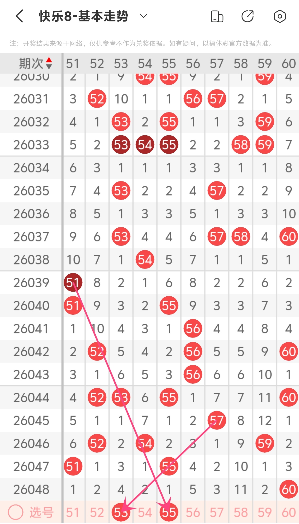 上期第六区间开出60,本期我们可以从上面走势图中看到选号的思路,本期推荐53 55