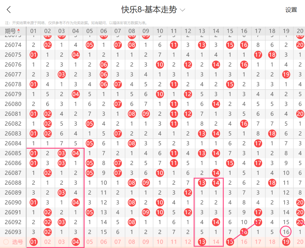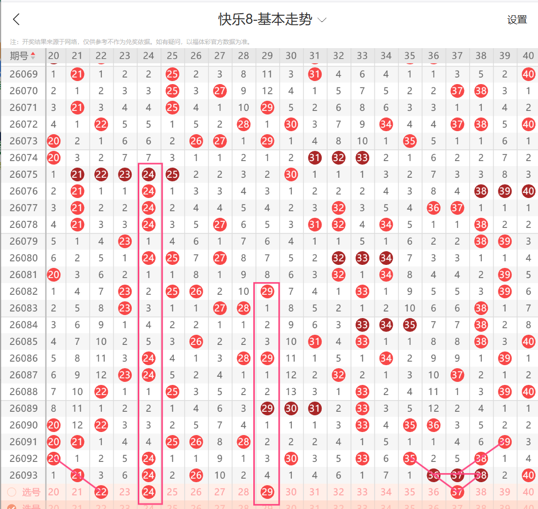 综上分析:快乐八第26094期走势遗漏形态分析,本期大底和区间胆码如下:
