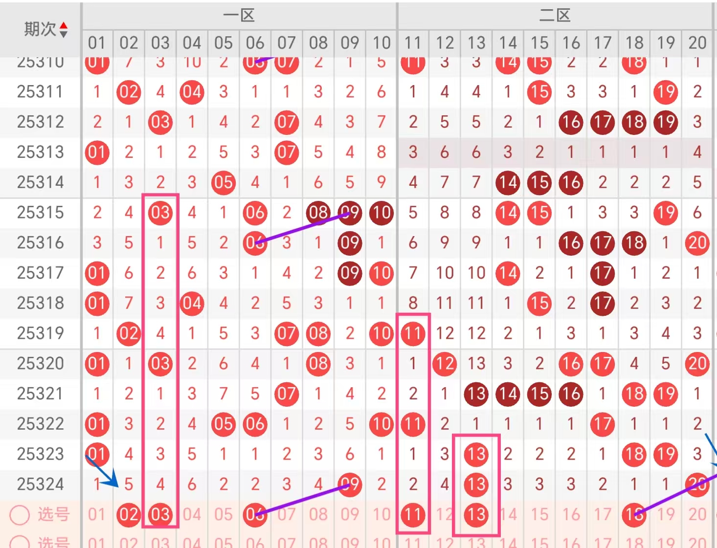 二区:(11-20):11是空一空一遗漏对称号码,13号码本期是看重,18和11都是空一空一的遗漏对称号码,18还有三码斜连走势!