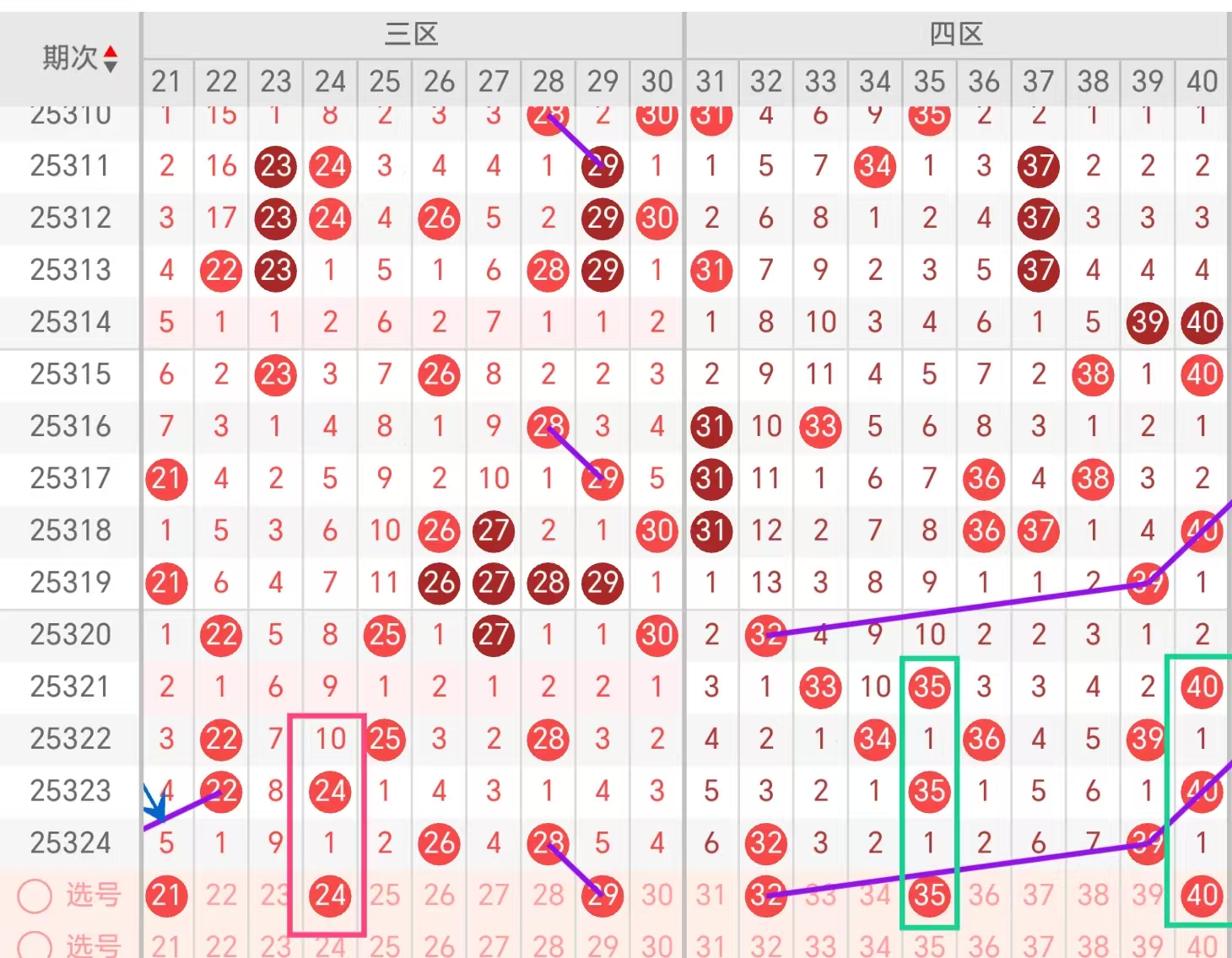四区:(31-40):35号码本人看重,39下35图上有同形态走势!35和40一样都是,空一空一遗漏对称形态!