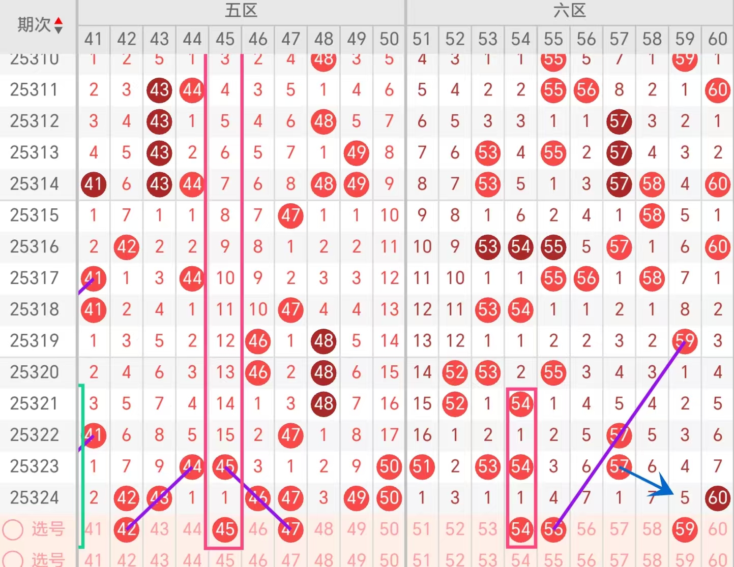 五区:(41-50):42三码斜连(42-43-44)45大遗漏空一回补号码,47三码斜连号码,本期47看重!